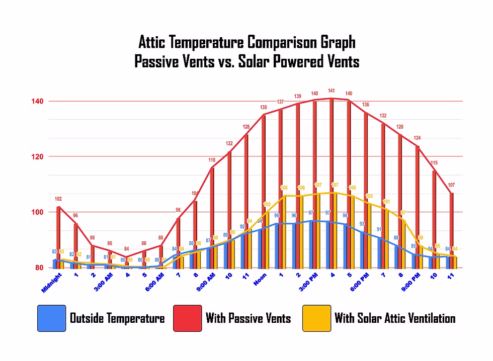 Check out the comparison chart below to see the difference in attic temperatures between homes using only ridge vents and those enhanced with a solar attic fan.
